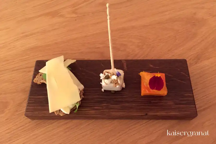 Auf dem kleinen Brett geht es weiter mit einer Käsebrot-Variante als Brotchip, Frischkäsecreme und Spänen vom kräftigen Bergkäse. Daneben findet sich ein Würfel Zungenwurst mit etwas Senf, der dem Fett der Wurst besser noch mehr Schärfe hätte entgegensetzen können. Den Schluss des Auftaktreigens bilden ein fruchtig-herbes Gelee aus Karotten und Sanddorn und ein Sanddorn-Chutney. Eine bewährte, frisch-säuerliche Kombination.