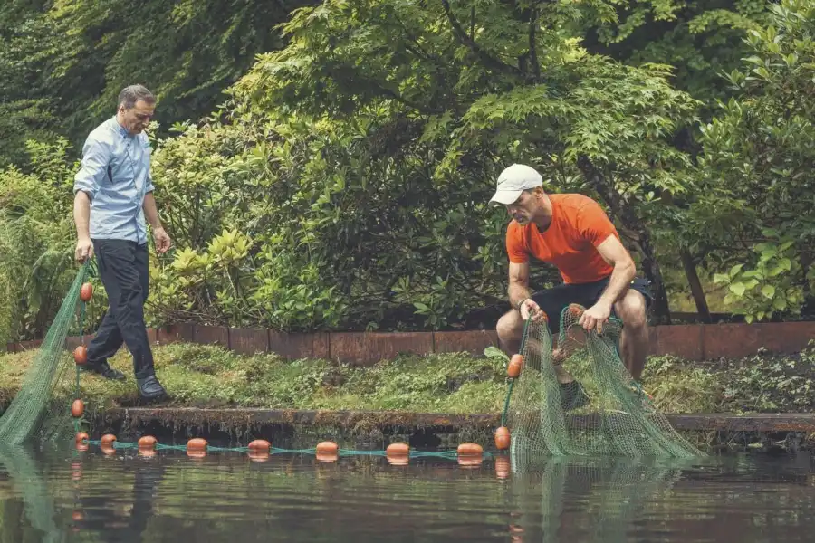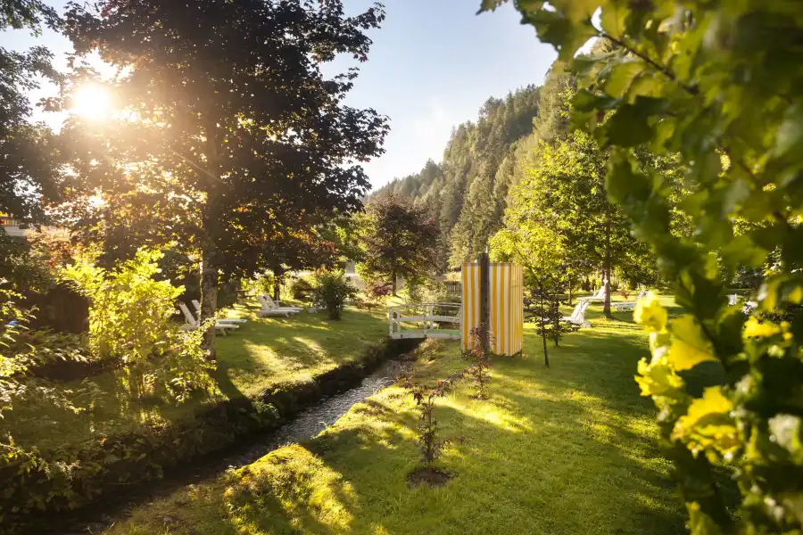 Zu der schönen Außenanlage zählen auch die eigenen Quellteiche. Hier im kalten und klaren Wasser schwimmen Saiblinge, Forellen und prächtige Huchen, die vor Ort in der Küche verarbeitet werden – frischer geht´s nicht. Die kleinen Wege durch die parkähnliche Anlage sind von alten Bäumen gesäumt, die im Frühling blühen und im Winter durch Rauhreif und Schnee fast glitzern.