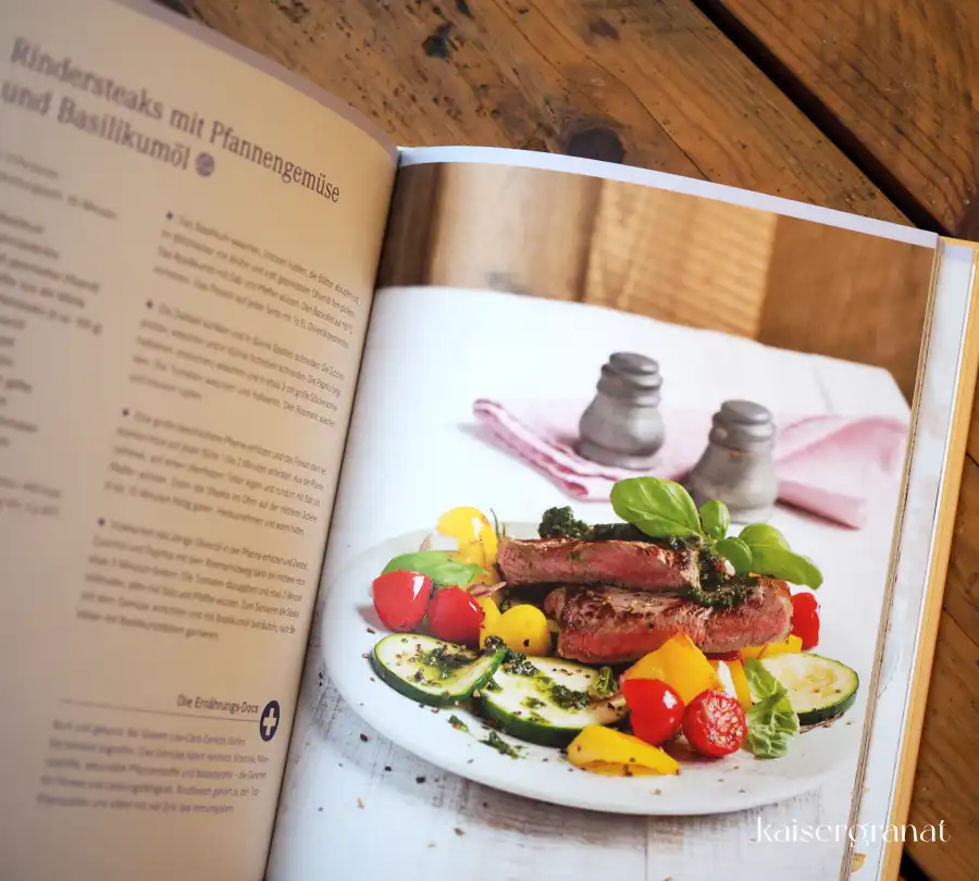 - Hauptgerichte, u.a. mit: Curry-Kokos-Eintopf mit Garnelen; gefüllte Bulgur-Paprika mit Gurkenquark; Rindersteaks mit Pfannengemüse und Basilikumöl