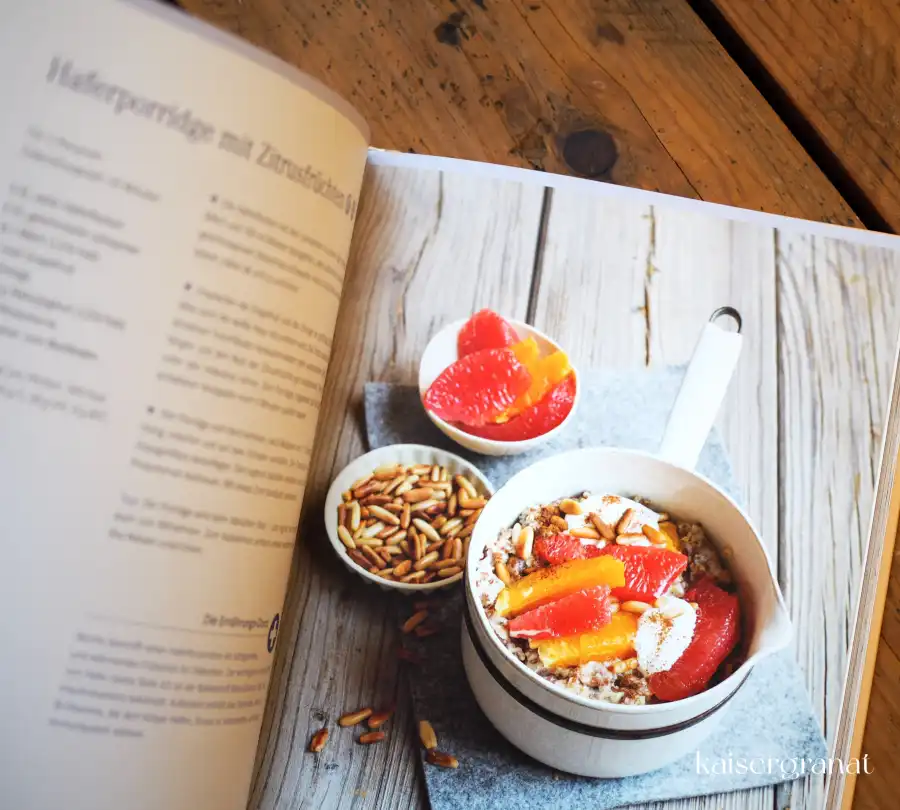 - Frühstück, u.a. mit: Dinkel-Knuspermüsli mit Beeren; Chia-Haferbrei mit Früchten; grüner Löffel-Smoothie mit Papaya