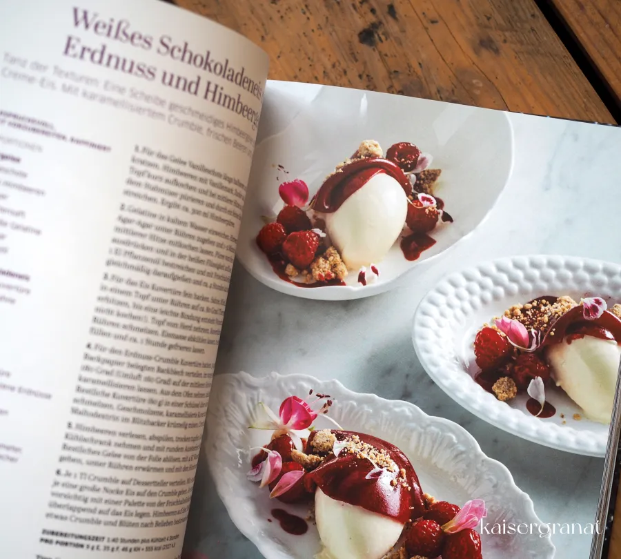Einige Beispiele sind Kaffee-Panna-cotta mit Karamellsauce, Joghurt-Parfait mit gesalzenen Limetten, pochierter Pfirsich auf Tonka-Sabayon, Schoko-Pavlova, Brombeer-Cheesecakes, Erdbeer-Holunderblüten-Sorbet auf Buttermilch-Mousse, weiße Schoko-Kokos-Mousse.