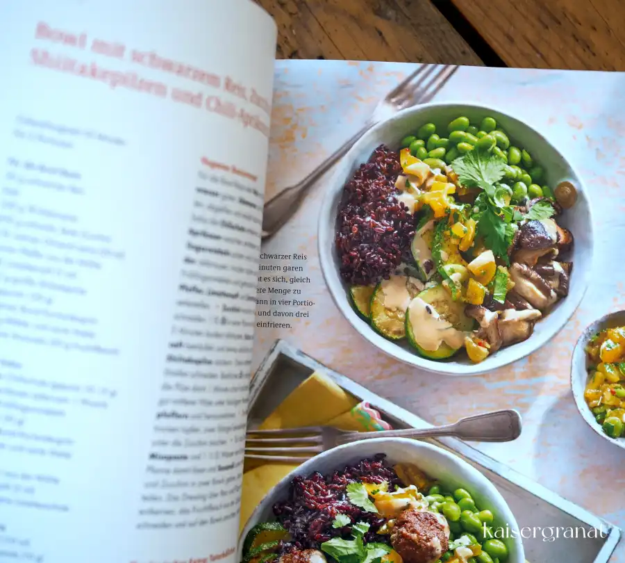 Die Rezepte sind kreativ und kommen weitestgehend ohne Ersatzprodukte aus. Beispiele sind der Blattspinat mit Blumenkohlröschen und Tahini-Dressing, Ofengemüse mit Guacamole und Rotkohlstreifen oder die Bowl mit gekeimtem Buchweizen, Himbeeren und Pekannüssen. Bei einigen Rezepten gibt es kurze Empfehlungen, was man (quasi als Beilage) noch als Mini-Portion Fisch oder Fleisch dazunehmen könnte.