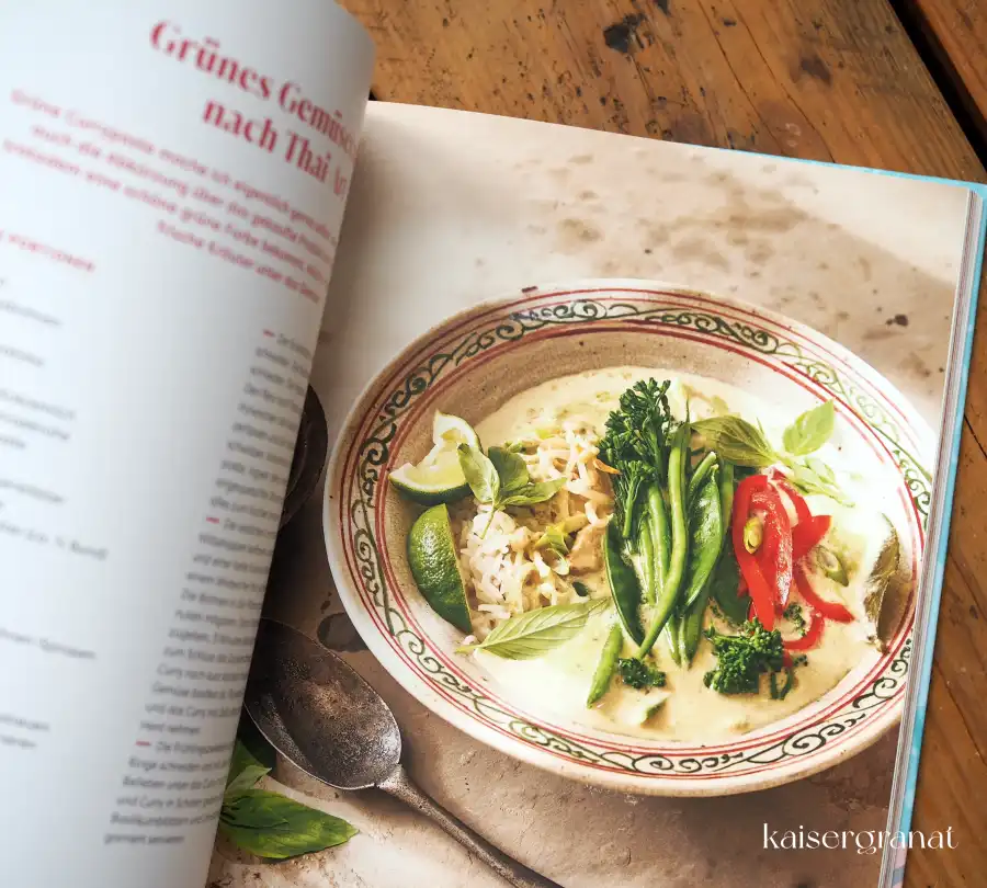 Einige Beispiele aus dem Kochbuch sind der libanesische Gemüsesalat mit Brotchips, Rettich-Radieschen-Salat mit Mandeldressing, Zitronen-Linguine mit Kirschtomaten und Rucola, grünes Gemüsecurry nach Thai-Art, knackiges Grillgemüse mit Pistazien-Romesco, Limetten-Mascparpone-Kuchen mit Erdbeeren, Frappé – griechischer Eiskaffee.