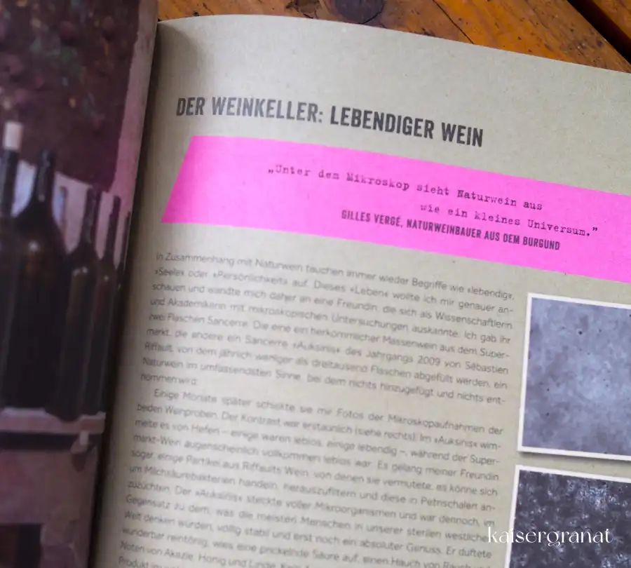 Über das ganze Buch verteilt gibt es immer wieder Exkurse zu spannenden thematischen Nebensträngen, geschrieben von Experten und Praktikern. Dabei geht es zum Beispiel um die Umstellung auf natürlichen Weinbau in der Praxis, die Arbeit mit Pferden oder die Wildkräuter aus dem Weinberg, die bei konventioneller Bewirtschaftung oft das Nachsehen haben.