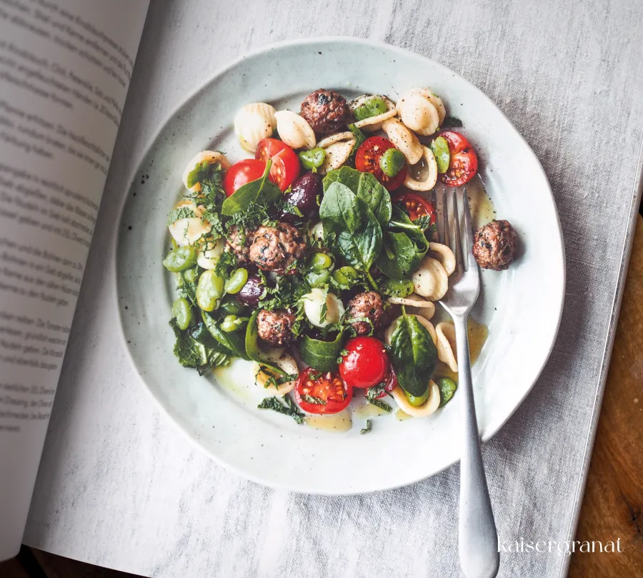 - Nudeln und Reis: Krautfleckerl mit Spitzkohl und Pilzen; Erbsenrisotto mit pochiertem Ei; Pasta mit Tomaten-Salsiccia-Sauce
