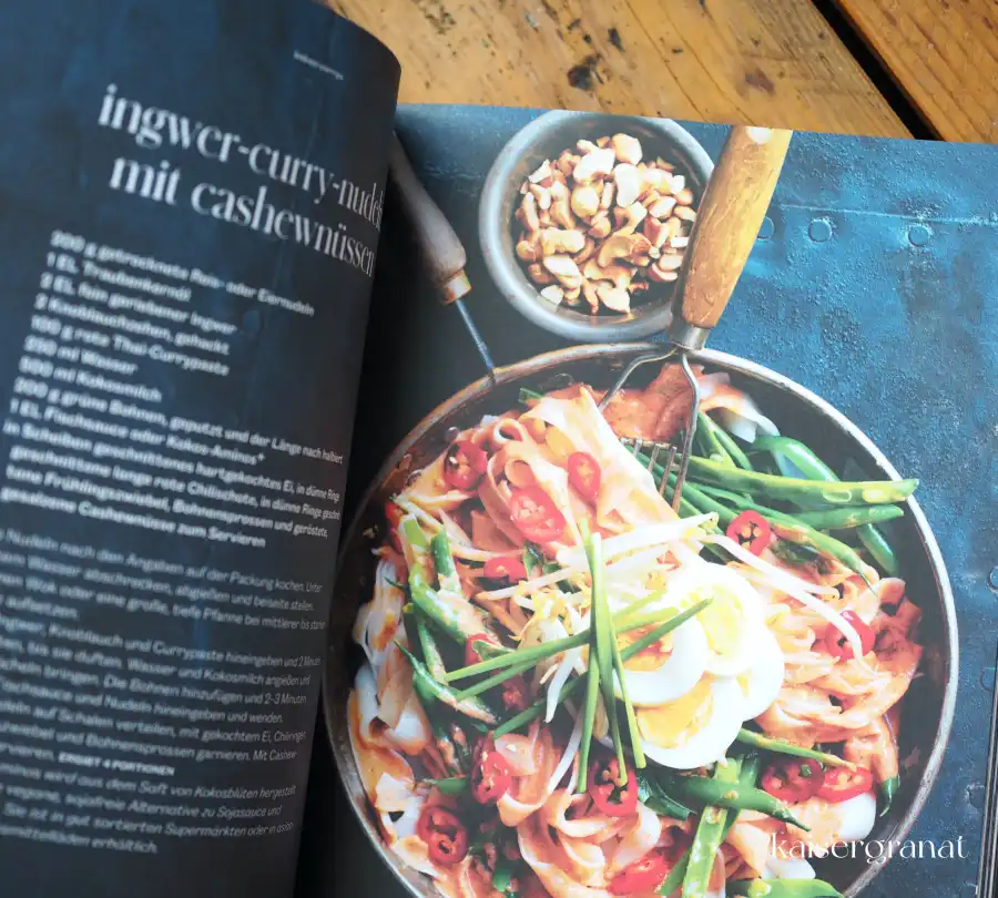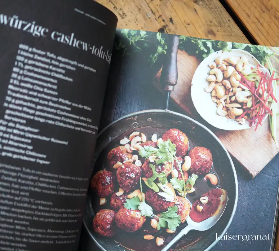 Konkrete Beispiele dazu sind das Blumenkohl-Schnitzel mit Blauschimmelkäse, Grünkohl-Zitronen-Parmesan-Bällchen, Ingwer-Curry-Nudeln mit Cashewnüssen, grünes Gemüse mit Knoblauch-Quinoa, Zitronen-Chia-Cheesecake-Pudding.