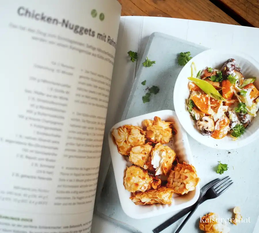 Leinölfrühstücksquark mit Beeren, Knuspermüsli ohne Zucker, kerniges Knäckebrot, Brot mit Erbsenmus und Spiegelei, Kefir-Pancakes, Reis-Linsen-Salat mit Mangold, Spinat-Crespelle, Tomatenrisotto mit Ricottanocken, Quinoa-Buddha-Bowl, Chicken Nuggets mit Rahmkürbis, Ofenwurzelgemüse mit Bohnendip und die rote Linsen Kokossuppe.