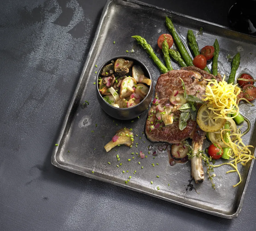 6. Auf den Tellern den Spargel mit den Tomaten anrichten. Jeweils 1 Kotelett mit Zitronenscheibe und Salbeibutter daneben-/daraufsetzen. Das Kartoffelstroh darüberverteilen und die Pilze separat dazu reichen.