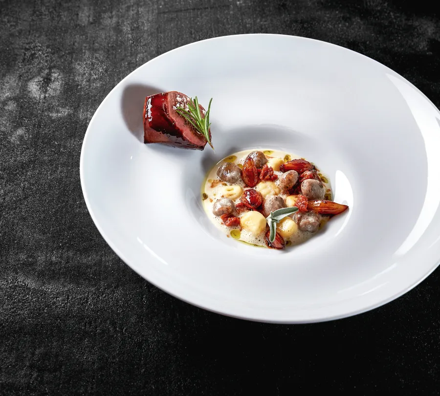 Süßrahmbutter in einer Pfanne aufschäumen lassen und feinst geschnittenen Salbei darin anbraten. Mit Zaubersalz Traube Tonbach würzen.